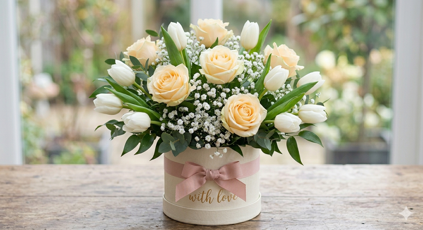 Пастельна палітра: Ніжні персиково-кремові троянди ідеально гармоніюють із тендітними білими тюльпанами, створюючи м’який світловий акцент.