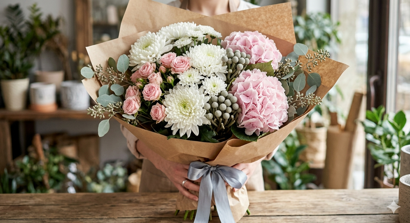 Еко-стиль: Лаконічна упаковка у крафтовий папір підкреслює натуральність та розкіш самих квітів, не затьмарюючи їх.