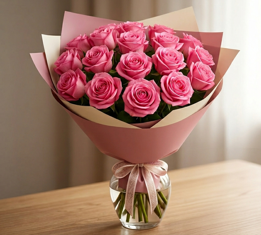 Стильне пакування: Двошарова матова упаковка у тон квітів з додаванням сірого акценту підкреслює глибину рожевого кольору та захищає тендітні стебла.