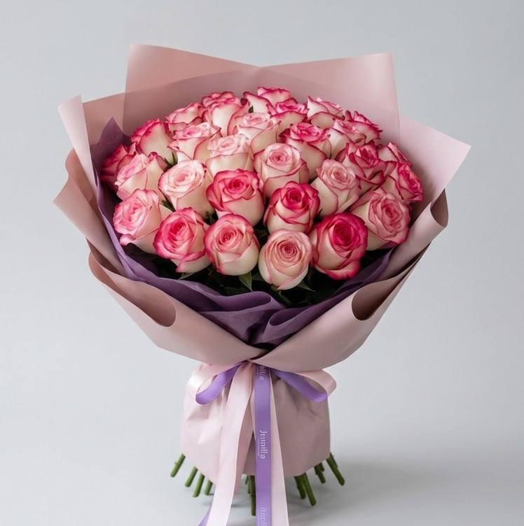 Це втілення ніжності, легкості та витонченого стилю. Головною зіркою композиції є дивовижні троянди сорту Jumilia, які зачаровують своїм унікальним забарвленням: плавний перехід від білосніжної основи до насиченого рожевого канту на кінчиках пелюсток. Цей букет нагадує про екзотичну красу та витонченість рожевих фламінго.