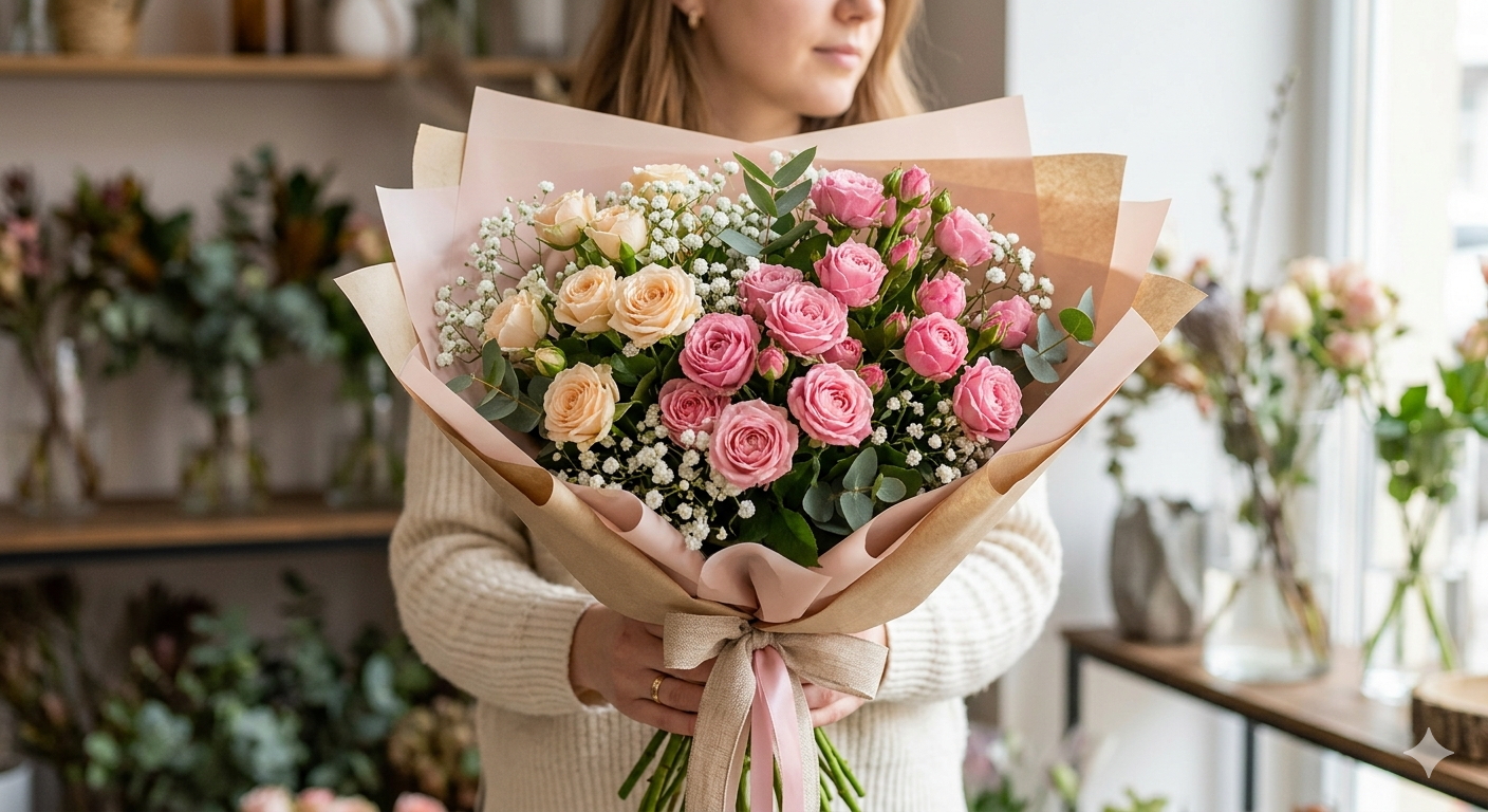 Це справжня ода витонченості. Поєднання соковитих рожевих та м’яких кремових троянд створює неймовірний ефект «зефірної» легкості, залишаючись при цьому статусним та розкішним подарунком. Це ідеальний вибір, коли потрібно зробити вишуканий комплімент або підкреслити особливу красу моменту.